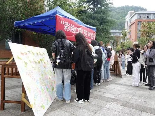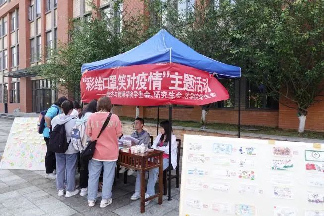 活动现场,展示的“彩绘口罩”作品整齐的罗列着,口罩上色彩斑斓的画笔传播着青春抗疫的正能量,凝聚着同学们对于战疫必胜的决心,吸引了广大同学的关注和喜爱。在现场设置的“防疫知识竞答”和“笑对疫情展板”互动活动中,同学们随机抽取题目进行作答,根据答对的题数获得相应的奖品,并在便利贴上写下疫情之下自己的所思所想及未来展望。“疫情虽未消散,但阻挡不了我们向阳而生的美好”,展示着同学们笑对疫情、积极向上的良好精神状态。